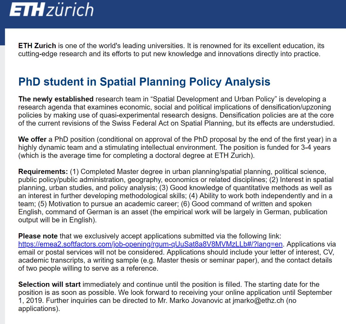 David Kaufmann Pa Twitter Job Ads I Am Searching Two Phd Students For The Newly Established Research Group In Spatial Development And Urban Policy Eth En Phd In Spatial Planning Policy Analysis