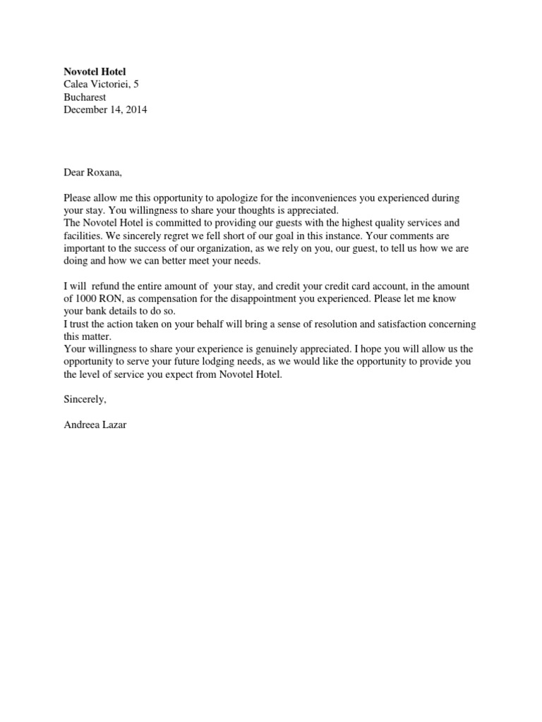 Hotel Reply To Letter Of Complaint